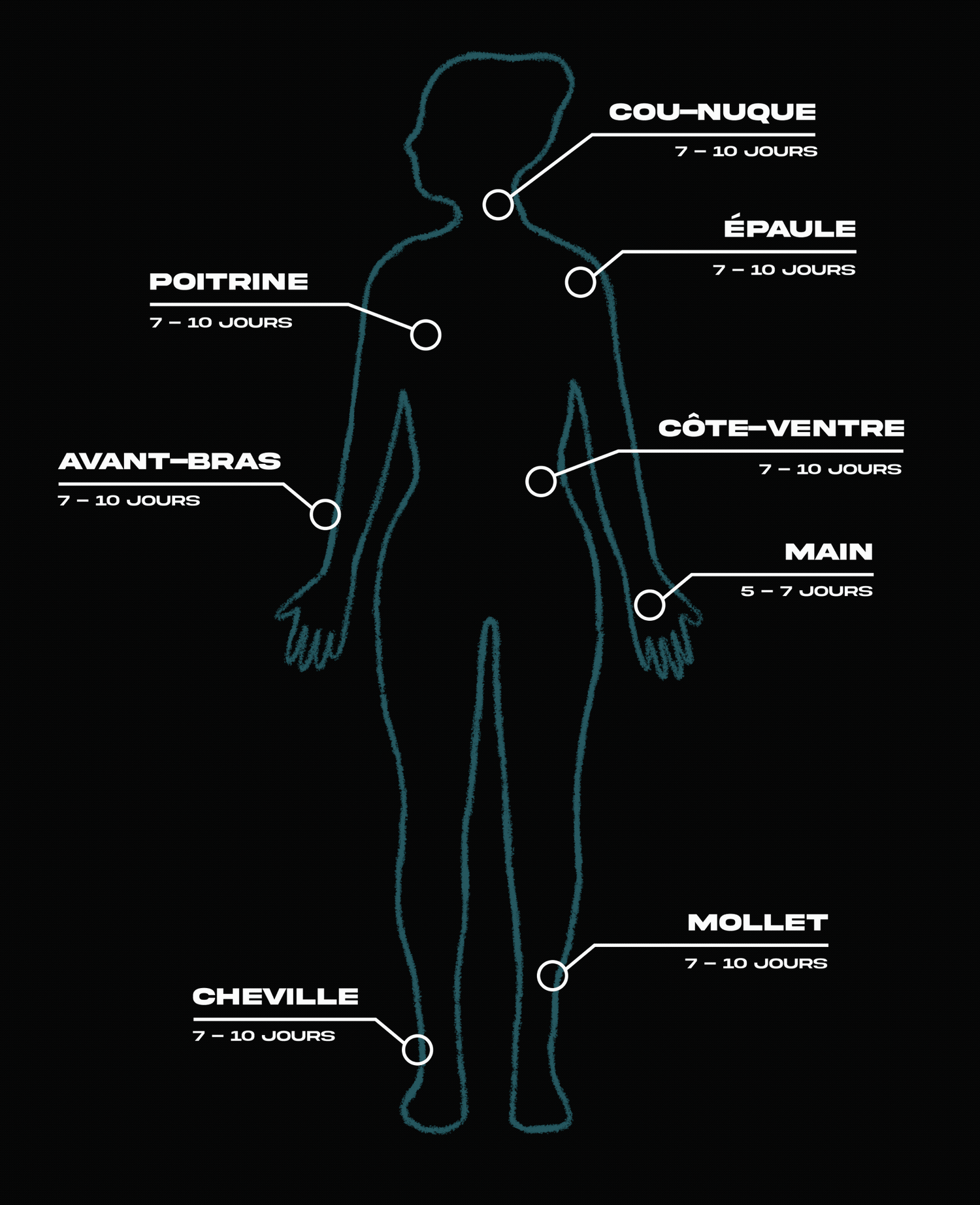 Une fois développé, le résultat te donnera l'apparence et la sensation d'un vrai tatouage pendant 7 à 10 jours et plus selon le type de peau.