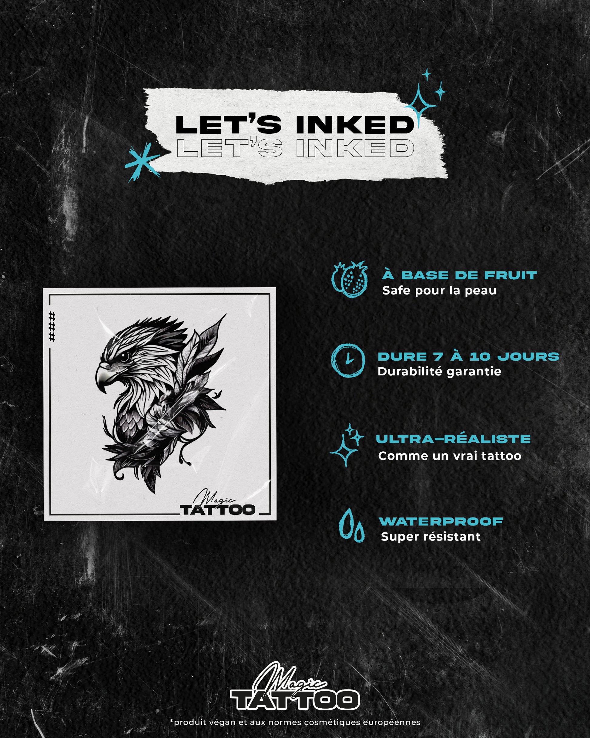Afin de garantir la sécurité de ta peau et de protéger les peaux sensibles, nos tattoos sont aux normes cosmétiques européennes et 100% vegan.